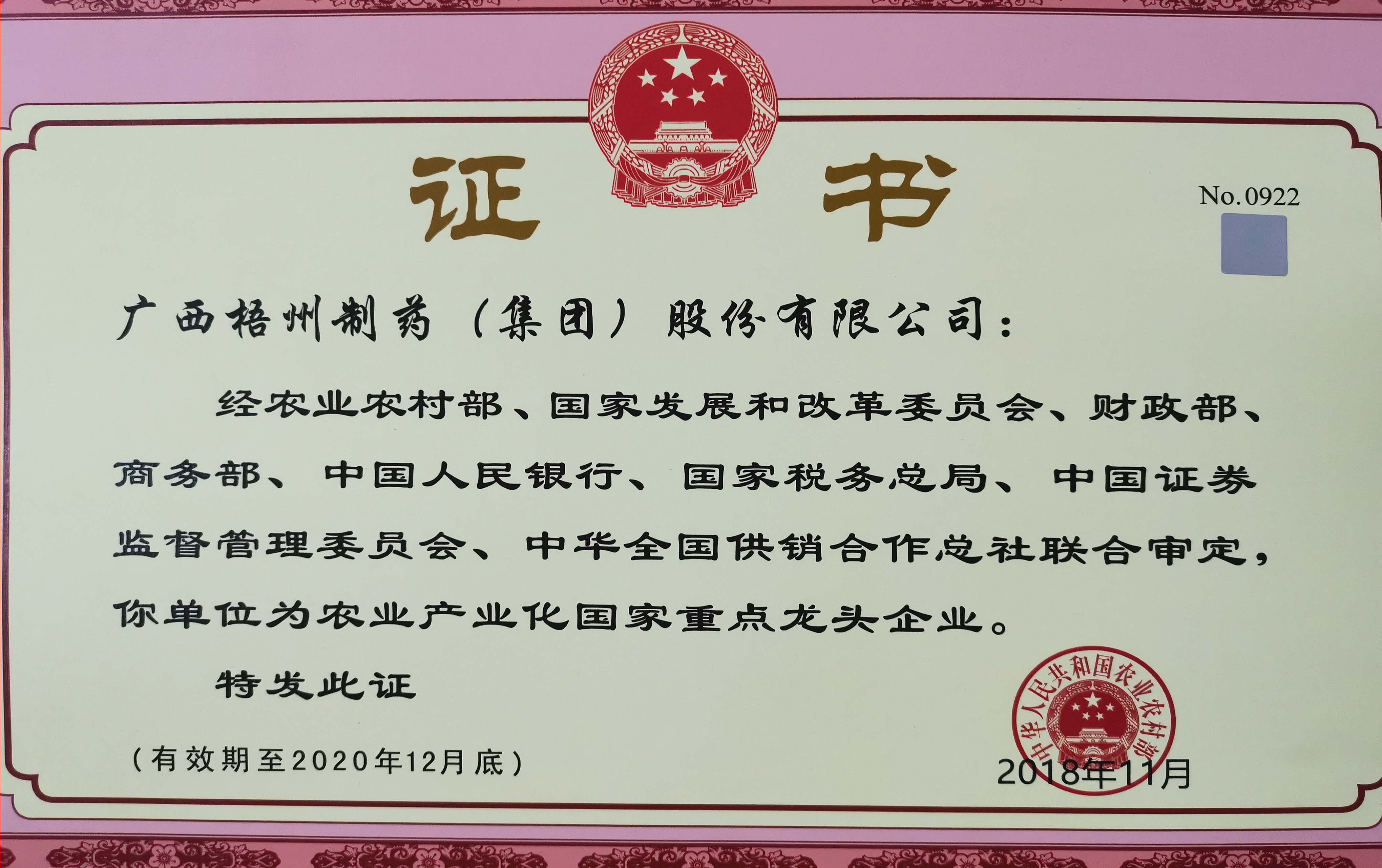 經(jīng)農(nóng)業(yè)農(nóng)村部、國家發(fā)展和改革委員會(huì)、財(cái)政部、商務(wù)部、中國人民銀行、國家稅務(wù)總局、中國證卷監(jiān)督管理委員會(huì)、中華全國供銷合作總社聯(lián)合審定,評(píng)為農(nóng)業(yè)產(chǎn)業(yè)化國家重點(diǎn)龍頭企業(yè)。