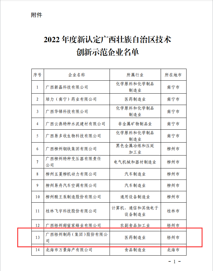 近日,廣西壯族自治區(qū)工業(yè)和信息化廳發(fā)布《自治區(qū)工業(yè)和信息化廳 自治區(qū)財(cái)政廳關(guān)于公布2022年度新認(rèn)定廣西壯族自治區(qū)技術(shù)創(chuàng)新示范企業(yè)名單的通知》,梧州制藥榜上有名,獲評(píng)為2022年度“廣西壯族自治區(qū)技術(shù)創(chuàng)新示范企業(yè)”。