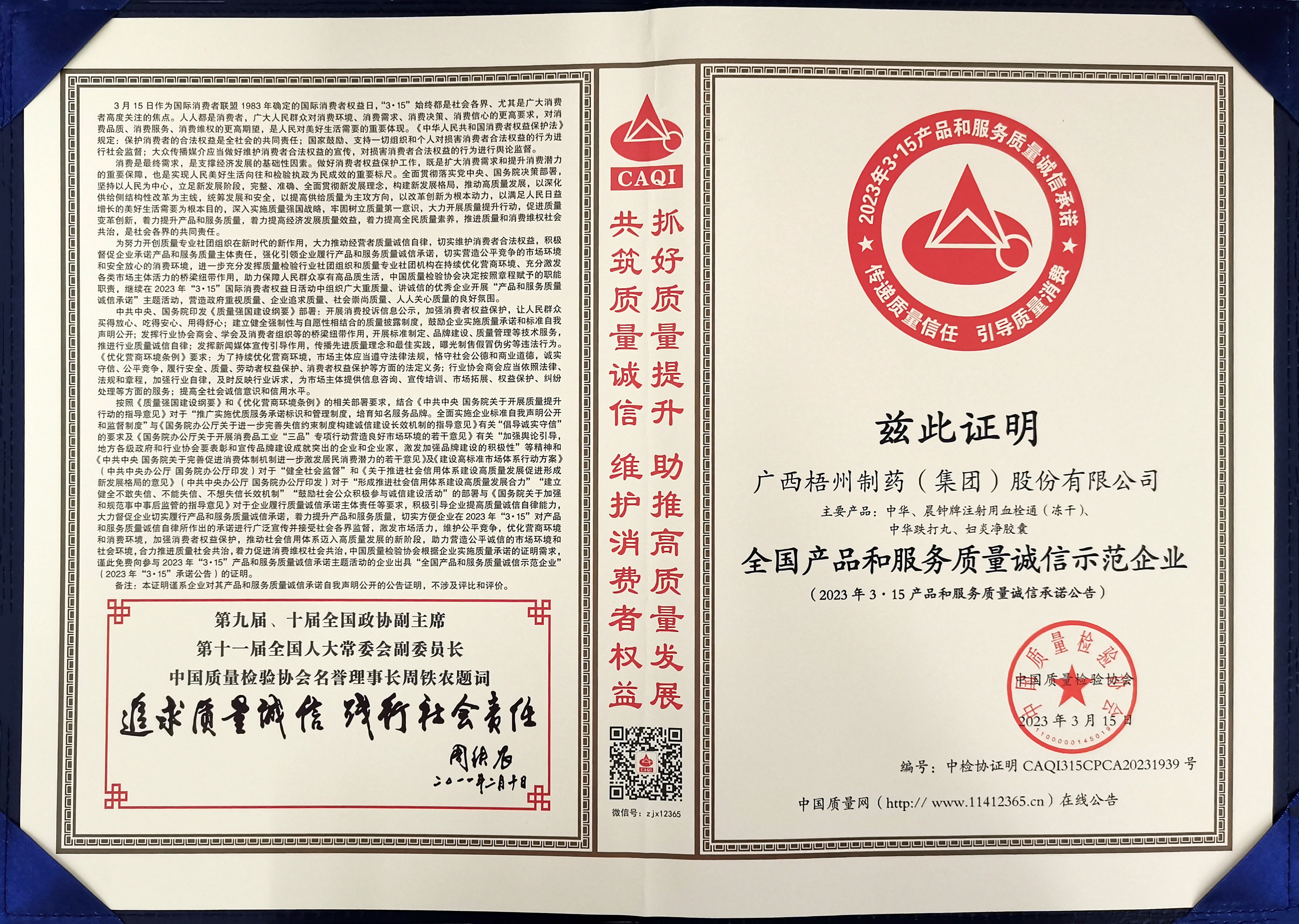 廣西梧州制藥(集團(tuán))股份有限公司榮獲2023年全國產(chǎn)品和服務(wù)質(zhì)量誠信示范企業(yè)