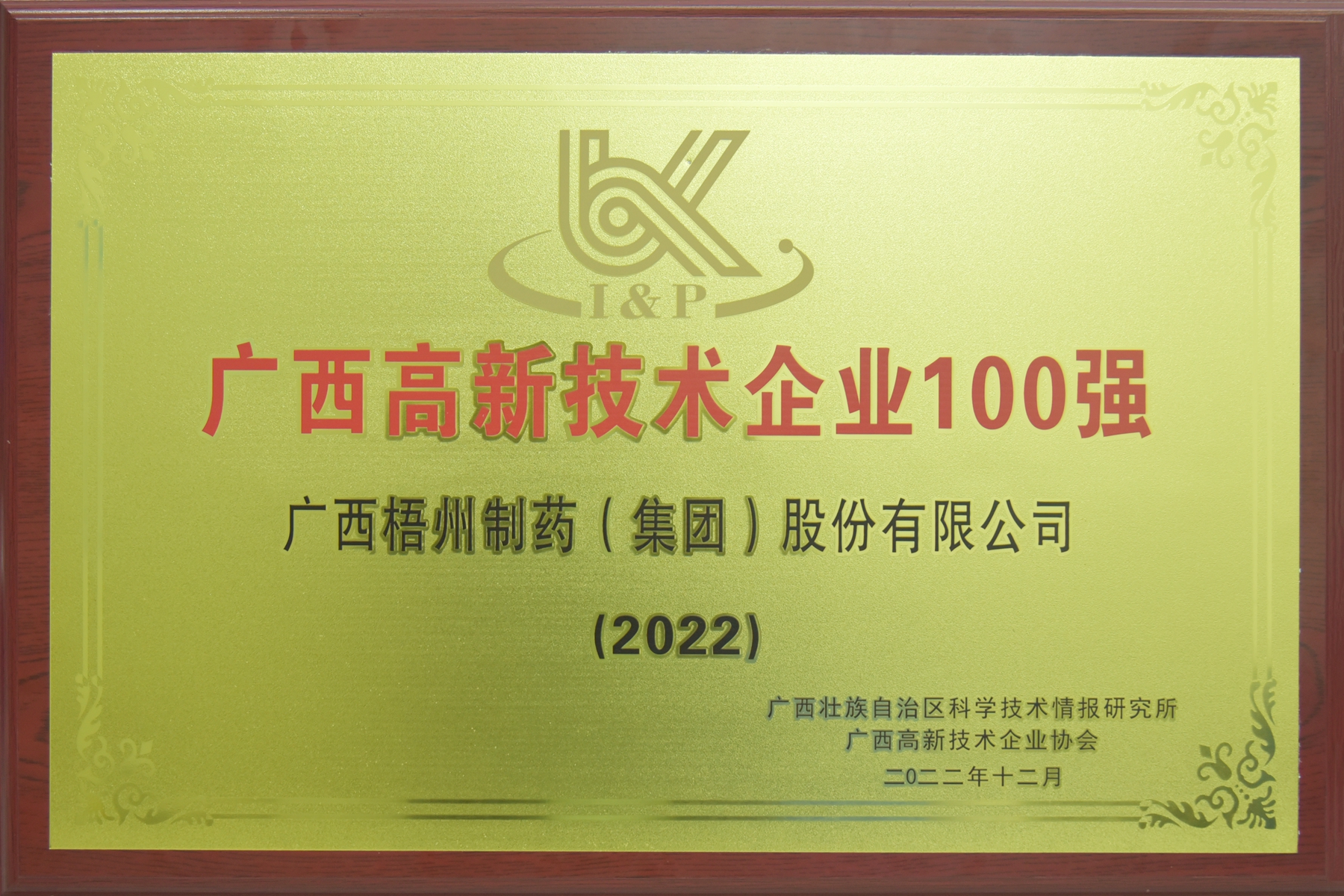 廣西梧州制藥(集團)股份有限公司獲評廣西高新技術(shù)企業(yè)100強【2022】