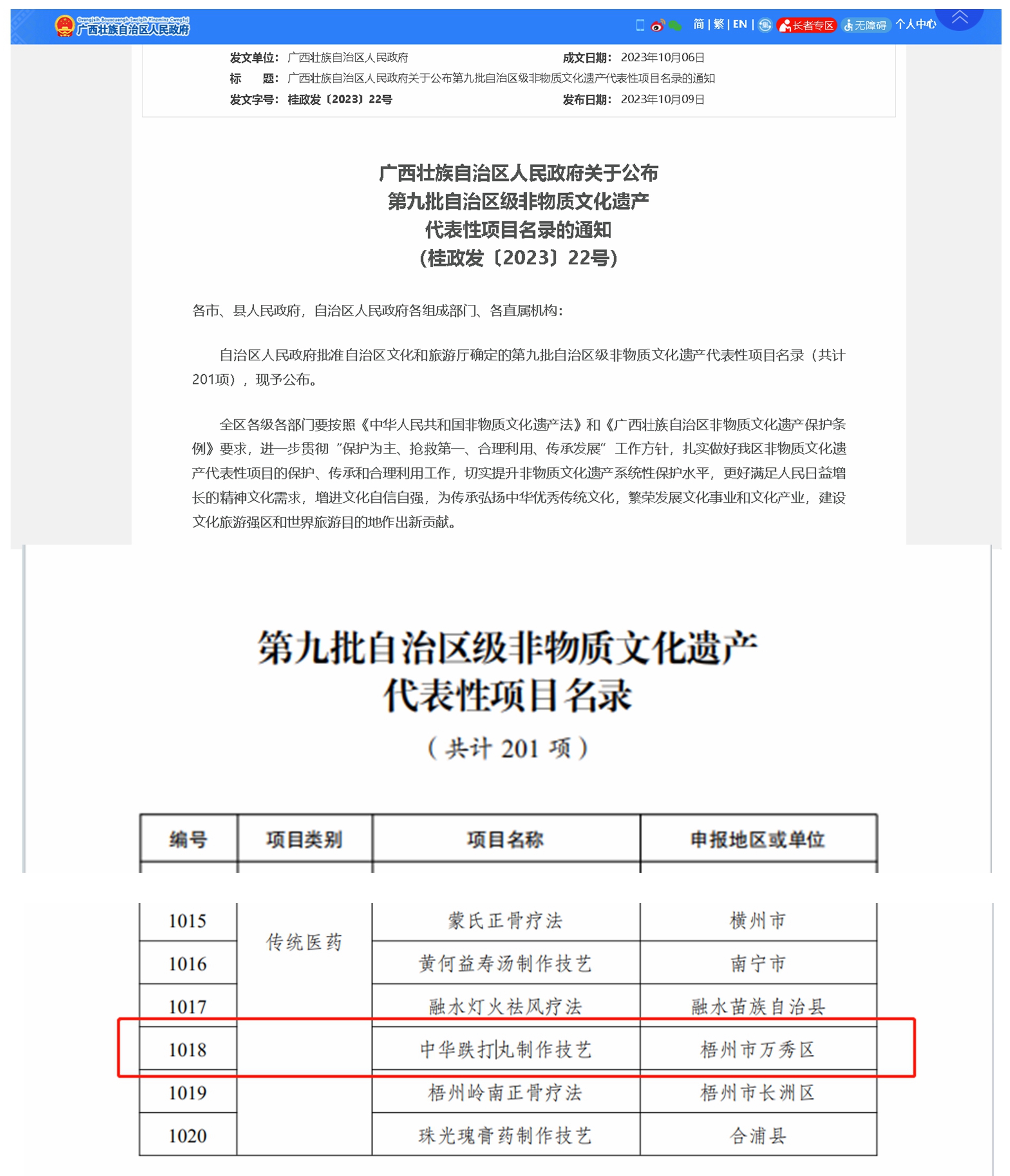 近日,廣西壯族自治區(qū)人民政府公布了第九批自治區(qū)級非物質(zhì)文化遺產(chǎn)代表性項(xiàng)目名錄,梧州制藥申報(bào)的中華跌打丸制作技藝成功入選,榜上有名。