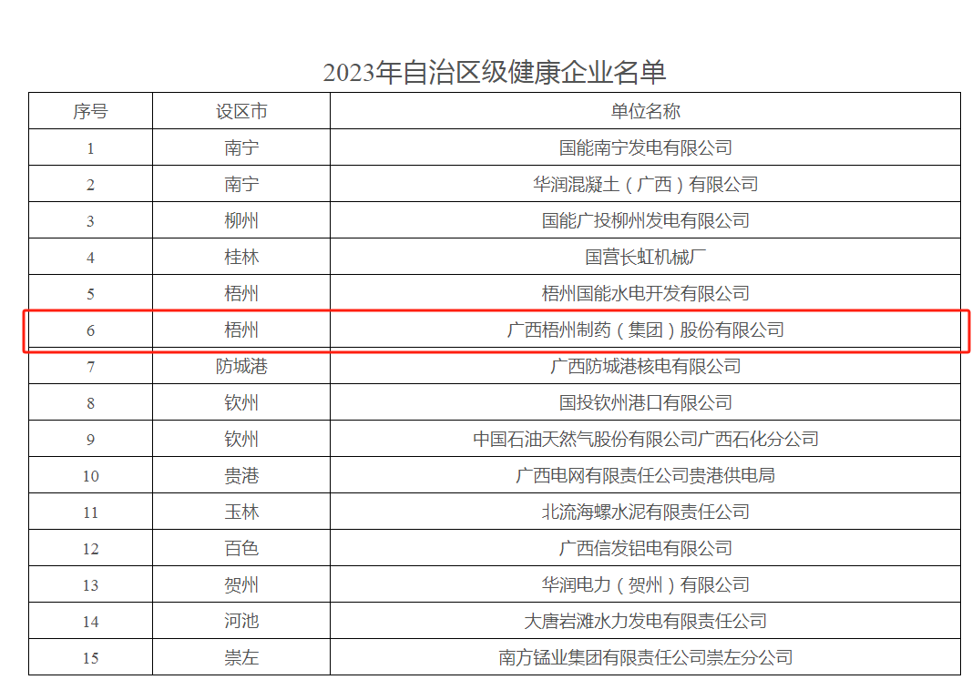 近日,廣西壯族自治區(qū)愛國衛(wèi)生運(yùn)動(dòng)委員會(huì)印發(fā)《自治區(qū)愛衛(wèi)辦關(guān)于公布2023年自治區(qū)級(jí)健康企業(yè)名單的通知》,其中,梧州制藥榜上有名,獲評(píng)“自治區(qū)級(jí)健康企業(yè)”稱號(hào)。