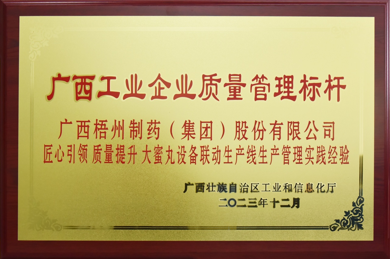梧州制藥生產(chǎn)管理實踐案例《匠心引領(lǐng)、質(zhì)量提升 大蜜丸設(shè)備聯(lián)動生產(chǎn)線生產(chǎn)管理實踐經(jīng)驗》被授予“廣西工業(yè)企業(yè)質(zhì)量管理標桿”榮譽,這是梧州制藥第四次獲評此榮譽稱號。同時,梧州制藥再次獲廣西質(zhì)量協(xié)會授予“廣西質(zhì)量管理先進單位”稱號。