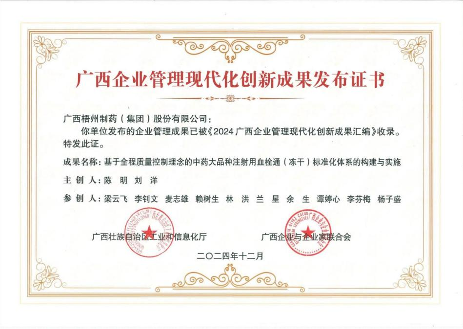 近日,由自治區(qū)工業(yè)和信息化廳、廣西企業(yè)與企業(yè)家聯(lián)合會聯(lián)合舉辦的2024廣西企業(yè)管理創(chuàng)新現(xiàn)場交流活動發(fā)布了2024廣西企業(yè)管理現(xiàn)代化創(chuàng)新成果匯編名錄,此次全區(qū)共有54家企業(yè)發(fā)布了73項企業(yè)管理現(xiàn)代化創(chuàng)新成果。梧州制藥申報的《基于全程質量控制理念的中藥大品種注射用血栓通(凍干)標準化體系的構建與實施》成果成功入選。