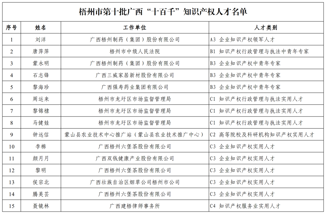 此次入選第十批廣西“十百千”知識產(chǎn)權(quán)人才名單,不僅是對兩名同志在知識產(chǎn)權(quán)領(lǐng)域所取得成績的肯定,更是對梧州制藥近年來深入貫徹廣西知識產(chǎn)權(quán)“十百千”人才工程建設(shè)要求,積極打造高素質(zhì)專業(yè)化的知識產(chǎn)權(quán)人才隊(duì)伍的認(rèn)可和鼓勵。