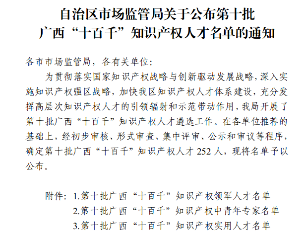 近日,自治區(qū)市場監(jiān)管局公布第十批廣西“十百千”知識產(chǎn)權(quán)人才名單,廣西梧州制藥(集團(tuán))股份有限公司副董事長、總經(jīng)理劉洋同志獲“A3企業(yè)知識領(lǐng)軍人才”稱號,藥學(xué)事務(wù)部知識產(chǎn)權(quán)專員蒙永明同志獲“B3 企業(yè)知識產(chǎn)權(quán)中青年專家”稱號。