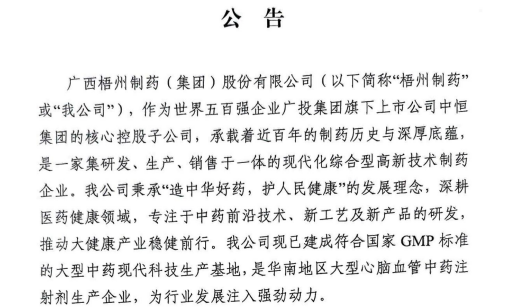 廣西梧州制藥(集團(tuán))股份有限公司招選公告廣西梧州制藥(集團(tuán))股份有限公司(以下簡稱“梧州制藥”或“我公司”),作為世界五百強(qiáng)企業(yè)廣投集團(tuán)旗下上市公司中恒集團(tuán)的核心控股子公司,承載著近百年的制藥歷史與深厚底